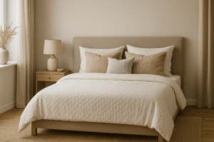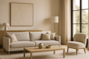 - Färger: beige, greige, dämpade jordtoner och mjuka kontraster.