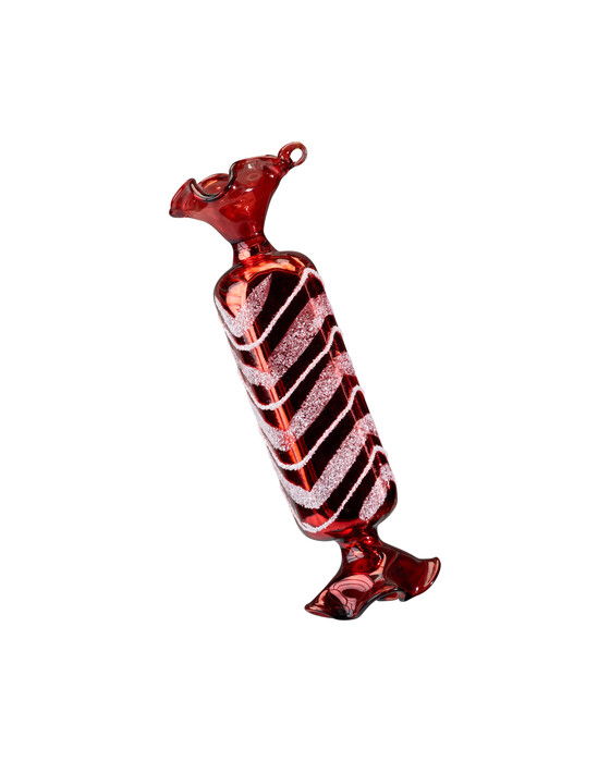 Dekorativ julgransdekoration i form av en röd karamell med vitt glitter som skapar en sagolik atmosfär i ditt hem.