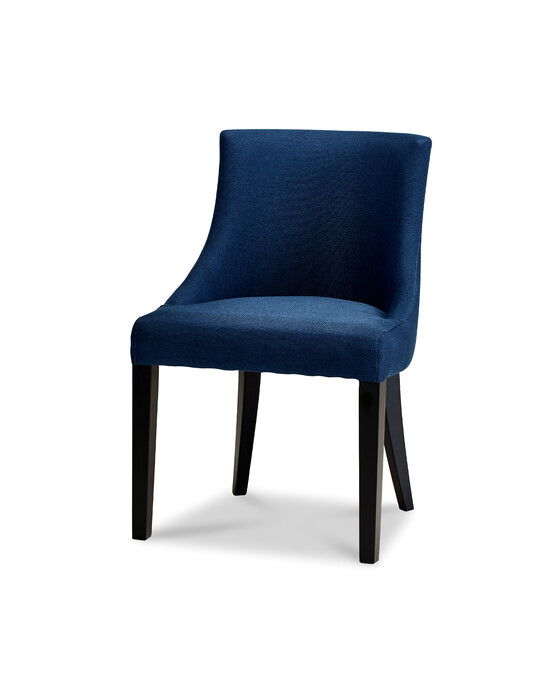 Material | Polyesterklädsel i färgen indigo, stolsben av björk med mörkbrun bets |