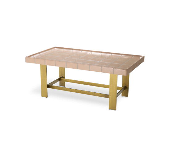 Upptäck det enastående eleganta Adrian soffbordet, smyckat med en mild rosa keramisk glasyr som avger subtil sophistication. Den borstade mässingfinishen förhöjer dess lyxiga lockelse, vilket gör detta bord perfekt för krävande kunder som söker diskret lyx. Dess harmoniska blandning av färger och material fångar förfinad elegans, och erbjuder en chic tillsats till alla högklassiga miljöer.