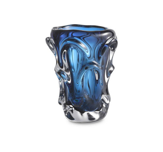Den munblåsta Aila vasen är tillverkad av blått glas och har bågformade detaljer. Med sina dimensioner på Ø: 19 x H: 23 cm passar den perfekt på ett soff-, sidobord eller en hylla och bidrar med en konstnärlig touch till ditt hem.