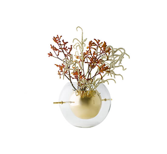 Alba är en vacker rund vas i mässing och munblåst glas från Klong. Vasen utmanar det traditionella sättet att arrangera blommor genom sin innovativa design. Relationen mellan skålarna skapar den perfekta vinkeln för snittblommor, vilket ger stjälkarna gott om vatten och en stabil plats att vila på. Dess unika design gör det möjligt att skapa vackra stilleben med grenar, blad eller blommor mellan skålarna.