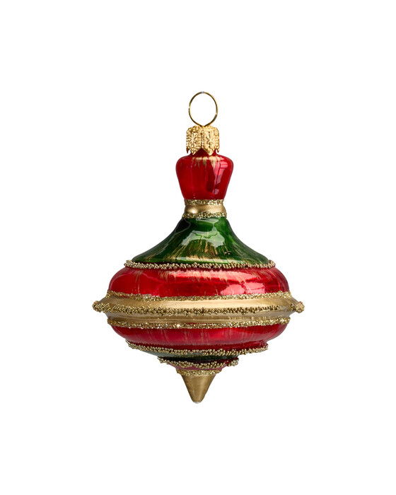 Denna klassiska julgransdekoration i glänsande rött, grönt och guld är perfekt för att skapa en nostalgisk och festlig känsla i din julgran. Med sina noggrant utformade detaljer fångar den ljuset och skapar en varm och traditionell touch. Perfekt att hänga upp i granen för en inbjudande julstämning. Observera att denna dekoration levereras utan upphängningsband.
