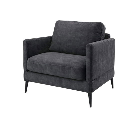 Andorra andas elegans och exklusivitet med denna stilfulla fåtölj i mörkgrå sammet. Fåtöljen är mycket bekväm och mjuk med stoppning av skum, en stomme av MDF och ben av metall. Med hög kvalitet och skön sittkomfort passar den in i de flesta hem.