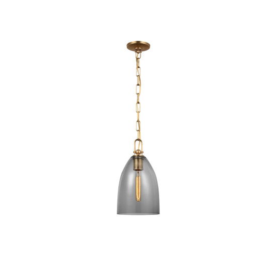 Andros takpendel i antik mässing med konisk skärm i rökfärgat glas är en elegant tolkning av klassisk design med moderna uppdateringar. Idealisk för belysning i kök, vardagsrum eller korridorer.