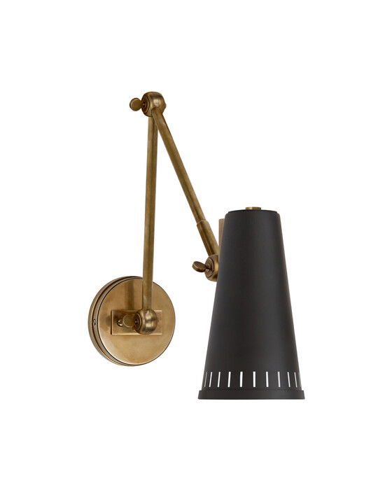 Den Antonio justerbara tvåarmade vägglampan i handgnidad antik mässing med mattsvart skärm är en stilren och funktionell belysningslösning för ditt hem. Med sitt eleganta design och justerbara armar ger den ett perfekt ljus för att skapa en mysig atmosfär i rummet.