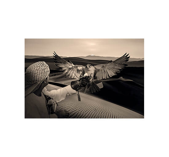 Arabian Hunt from Cobra Art är ett svartvitt konstverk som skildrar den traditionella falkjakten i den arabiska öknen. Med en falk i full språng mot en bakgrund av majestätiska sanddyner, avspeglar motivet frihet, precision och det djupa bandet mellan människa och natur. Den dramatiska kontrasten och detaljrikedomen gör denna tavla till en kraftfull inredningsdetalj som förmedlar historia och elegans. Perfekt för den som vill skapa en sofistikerad och stilren atmosfär i hemmet eller på kontoret.