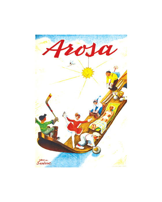 Discover the magic of winter in Arosa, Switzerland with this vintage poster that captures the lively and joyful atmosphere of the region. The charming illustration showcases a whimsical scene where skiers, skaters, curlers, and sunbathers come together to enjoy a variety of winter sports and activities. Arosa’s reputation as a top Swiss ski destination is highlighted in this poster, making it a perfect addition for collectors and ski enthusiasts alike.