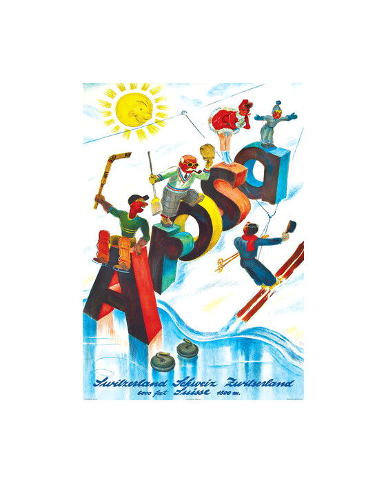 En klassisk schweizisk reseaffisch med charm och vintage-stil som bjuder in dig till snötäckt underverk i Arosa, Schweiz. Affischen visar ett glatt illustration av vintersportentusiaster som åker skidor, spelar hockey, åker konståkning, curlar och mer, och fångar den festliga och livliga andan i Arosas berömda vintersäsong. Mot en imponerande alpin bakgrund smälter affischens djärva, färgglada typografi sömlöst in i den dynamiska scenen och ger en känsla av rörelse och spänning. Den leende solen ovanför bidrar till den glada och inbjudande atmosfären, vilket gör denna affisch till ett måste för dem som uppskattar lekfull vintage resekonst, schweizisk skidkultur och klassisk affischdesign.