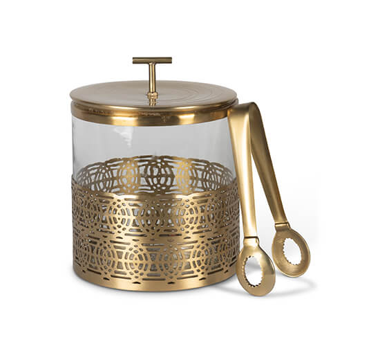 Denna eleganta ishink i glas och mässingsfärgad metall är en stilfull detalj på varje dukning. Med sina intrikata utskärningar och diskreta handtag skapar den ett lekfullt skuggspel i ljuset. Medföljande tång gör serveringen enkel och elegant, perfekt för långa middagar eller trädgårdsfester. En tidlös inredningsdetalj som ger hemmet en känsla av tidlös elegans och festlig stämning.