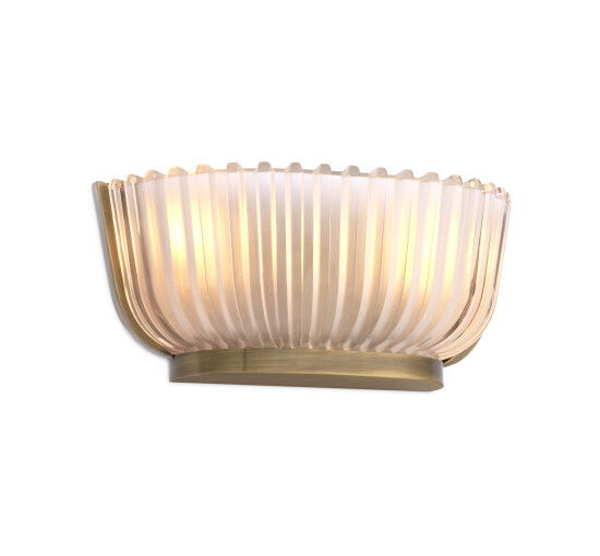 Artos vägglampa är full av stil, en perfekt blandning av vintage och modernt. Med en skålformad skärm av tjockt frostat glas och en vintage mässingsarmatur kommer den att kasta ett vackert sken i alla rum den är placerad i. Ett mönster av vertikala linjer ger skuggan en slående siluett.