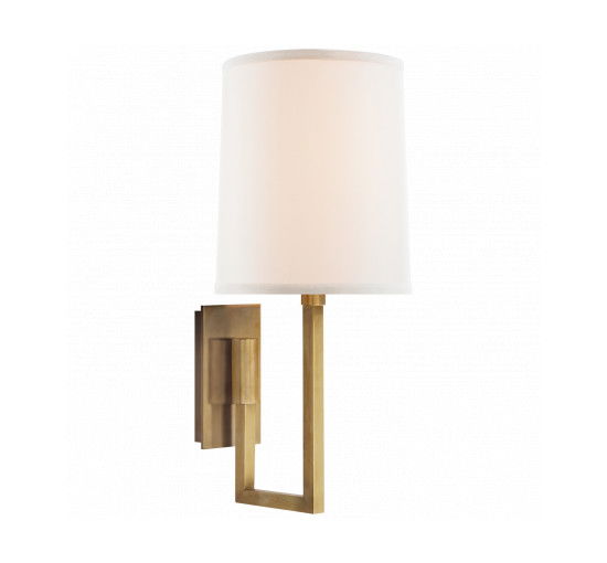 Aspect Library Sconce in Soft Brass with Ivory Linen Shade är en elegant och stilren vägglampa som passar perfekt i hallen, vardagsrummet eller sovrummet. Denna outlet-vara finns i begränsad kvantitet och kan ha mindre slitage eller repor, men inga större skador.