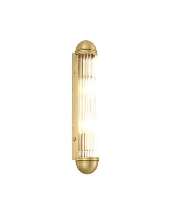 Den eleganta vägglampan Auburn från Eichholtz har ett distinkt Art Deco-utseende som passar fint i både traditionell och modern inredning. Den har en vacker mässingsfinish och klara vertikala glasstavar som ger den ett tidlöst och elegant utseende. Lampan är avsedd för fast installation och har en diskret kabel som sitter bakom väggplattan, vilket ger en smidig och stilren look.