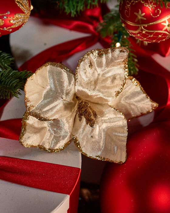 Den härliga Auriol juldekorationen är en vacker tygblomma i vitt med dekorativa detaljer i guldglitter. Den är perfekt för att dekorera granen eller att placera på det dukade julbordet.