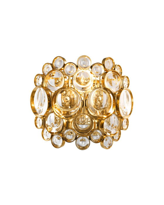 Avant vägglampan erbjuder inte bara en atmosfärisk ljuskälla, utan även en stilfull touch till ditt hem. Med runda bitar av klart glas monterade i en elegant guldfärgad ram, bildar den en halvcirkulär lampskärm som sprider ljuset på ett vackert sätt.