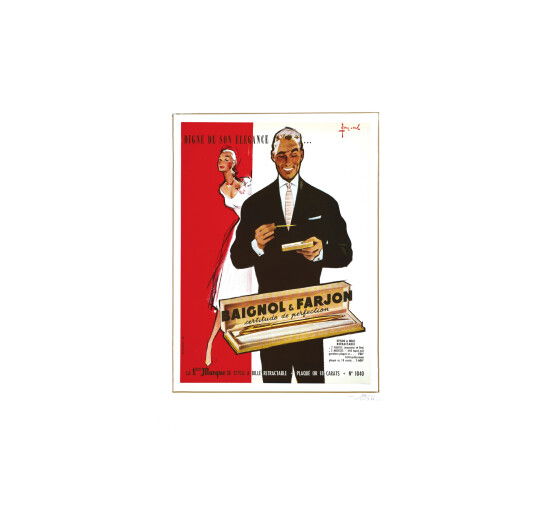 En charmig illustration från 1956 som utstrålar elegans och sofistikerad stil. Motivet visar en välklädd gentleman i klassisk kostym, som håller en exklusiv penna med självsäkerhet och stolthet, med en elegant kvinna i bakgrunden för en touch av glamour. Färgpaletten av djup röd, vit och svart framhäver klassisk design och tidlös elegans, perfekt för att addera nostalgi och lyx till ditt hem.