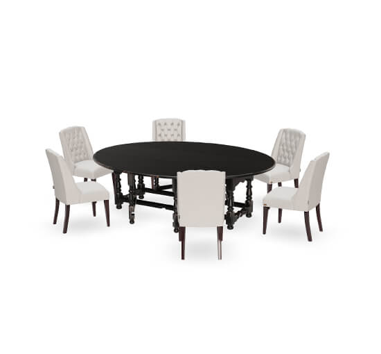 Denna stilrena matgrupp består av Balmoral matbord och sex stycken Venice matstolar. Balmoral är ett gediget och klassiskt matbord med uppfällbara skivor i vacker svart färg, perfekt för att samla familj och vänner. Venice är en tidlös och stilfull matstol tillverkad av högkvalitativa materialval för optimal balans mellan kvalitet och design. Med sitt pikerade långa ryggstöd med knappar och mjuka stoppning av kallskum, ger Venice en bekväm och elegant känsla.
