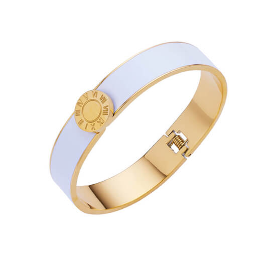 Denna vackra vitfärgade armring i stål är dekorerad med en stilren platta som pryds av romerska siffror. Armbandet är försett med en 14k guldplätering och är allergitestat samt fritt från nickel. Ett elegant och tidlöst smycke som passar perfekt till alla tillfällen.