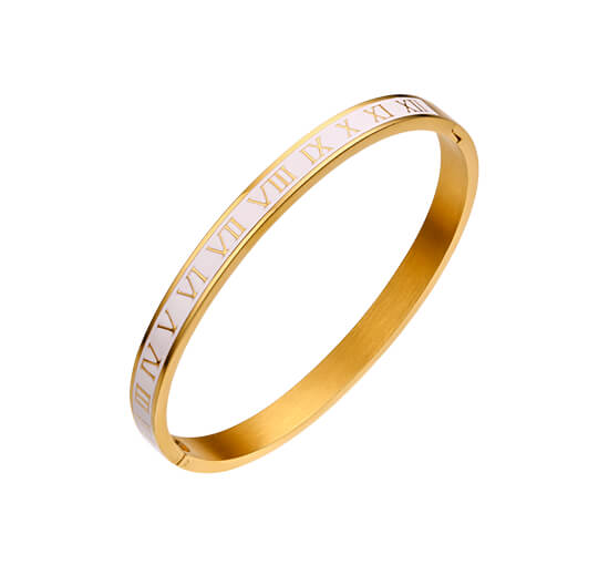 Dekorera din handled med detta vackra vita armband i stål med eleganta romerska siffror. Med en 14k guldplätering är detta allergitestat och fritt från nickel, perfekt för den stilmedvetna användaren.