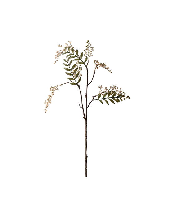 Denna bärkvist är en stilfull och naturtrogen konstgjord dekoration med eleganta grenar prydda av små vita bär och gröna blad. Perfekt för att ge fyllighet och textur till blomsterarrangemang eller som en enkel, dekorativ detalj i en vas.