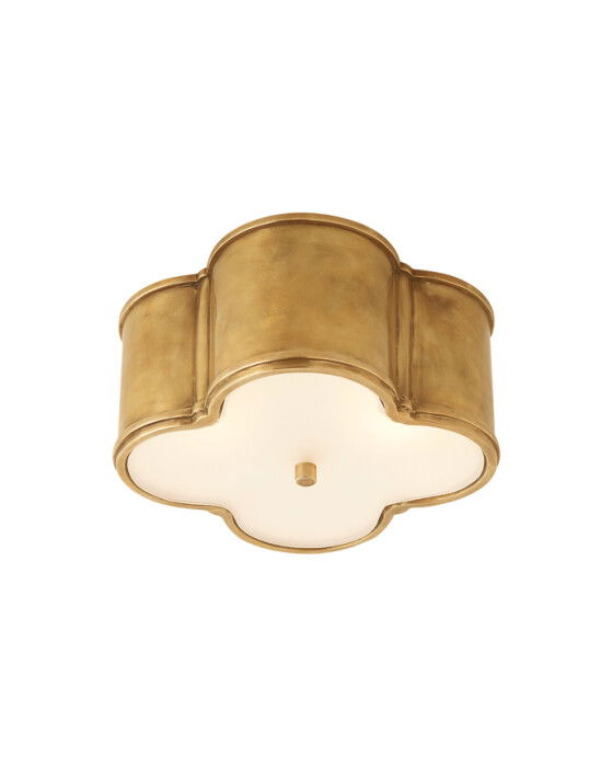 Den lilla Basil Flush Mount i naturmässing med frostat glas är en elegant taklampa som passar perfekt för att skapa en mysig atmosfär i ditt hem.