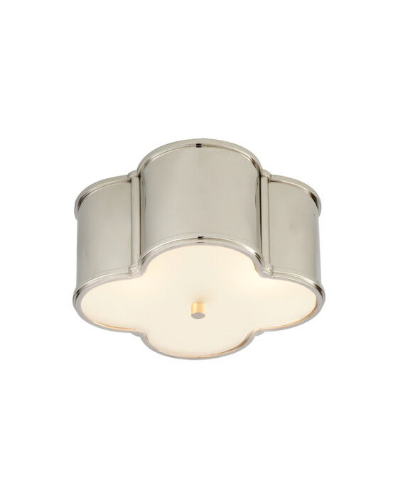 Small Basil Flush Mount in Polished Nickel with Frosted Glass is a stylish and modern lighting solution for any room. With its sleek design and high-quality construction, this ceiling light is sure to enhance the aesthetic of your space.