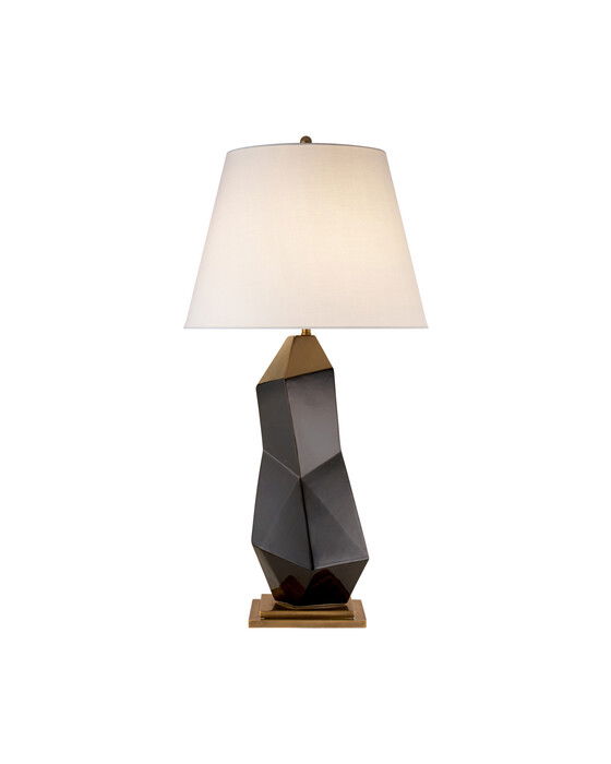 Bayliss bordslampa är en eleganta belysning med en ikonisk design som passar perfekt in i moderna interiörer. Tillverkad av handsidad sten i abstrakta former, den har en minimalistisk palett av svart och vitt med metalliska accenter och en linneskärm, designad av Kelly Wearstler.