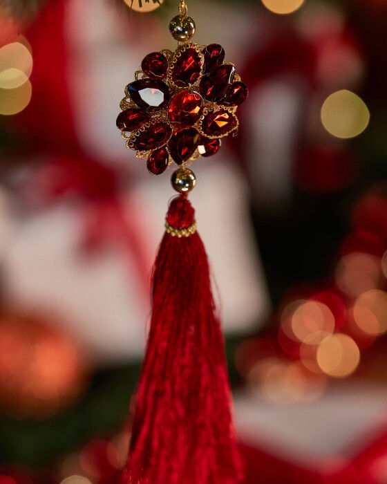 Denna eleganta juldekoration kombinerar gnistrande röda ädelstensliknande detaljer med en lyxig mörkröd tofs. Den gyllene kroken gör det enkelt att hänga upp dekorationen i granen eller dekorera på andra platser i hemmet. Perfekt för att skapa en varm och inbjudande atmosfär under julfirandet.