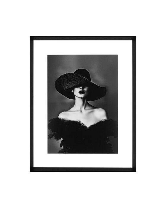 Beautiful Lady I är ett konstnärligt porträtt som utstrålar sofistikerad elegans. I svartvitt framträder en kvinna klädd i fjäderprydd klänning och en bred svart hatt som delvis skymmer hennes ansikte. Kontrasten mellan mörker och ljus skapar en dramatisk effekt som för tankarna till haute couture och tidlös filmstjärneglans.