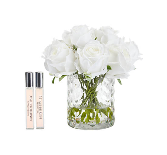 Upptäck elegans och doft i ett med Bouton de Rose gåvoset. Det exklusiva setet innehåller en dekorativ blombukett med högkvalitativa konstrosor och en fin glasvas. Spraya blommorna med medföljande rumsdoft för en förtrollande doftupplevelse.