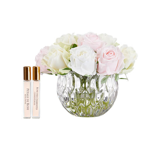 Upptäck den vackra Bouton de Rose Luxe gåvosetet – en exklusiv blombukett tillsammans med rumsparfym i en tjusig rund glasvas. Denna eleganta bukett består av högkvalitativa konstrosor i vitt, grönt och ljusrosa, komplett med en gelé som ger stadga åt blommorna. Med dofterna Petale de Rose och Charente Rose kan du njuta av en harmonisk blandning av aromer som påminner om det franska provinsbylivet.
