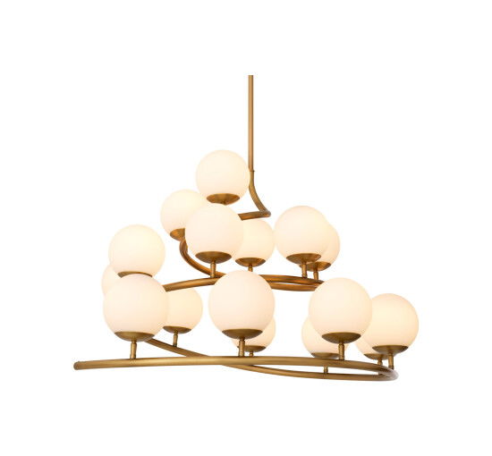 Brissac takkronan är en himmelsk dans av elegans och charm. Med en antik mässingsfinish och en förtrollande krökt design inspirerad av naturens graciösa rörelser, ger denna takkrona en touch av lekfullhet och förförelse. Prydd med 16 eteriska vita glasskärmar, förvandlar den varje utrymme till en himmelsk fristad av varmt och inbjudande ljus.