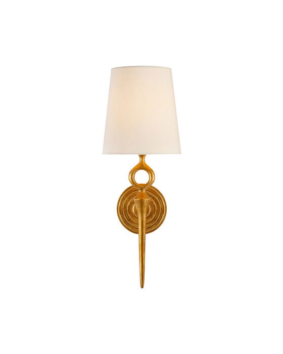 Den Bristol vägglampa Gilded från AERIN tolkar om en tidlös design med spännande detaljarbete. Den glänsande metalliska stommen visar upp slingrande och skårade detaljer medan en avsmalnande linneskärm sprider varmt ljus perfekt för vardagsrum eller arbetsrum.