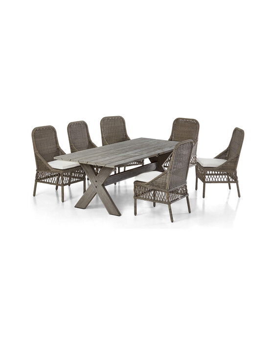 Den stilfulla och klassiska utemöbelgruppen från Artwood består av sex Brussel matstolar och ett Cross matbord. Matstolarna är tillverkade i väderbeständig konstrotting med aluminiumstomme för minimalt underhåll. Ljusa sittdynor med avtagbar polyesterklädsel medföljer. Cross matbordet är tillverkat i gråbehandlat teak med en vacker patina, perfekt för altanen eller uteplatsen.