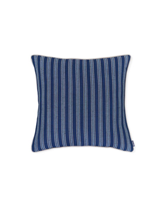 Ett stilfullt kuddfodral tillverkat i bomull och jute med klassiskt randigt mönster. Rustika ränder i två toner av blått pryder tyget och ackompanjeras av vita kritstrecksränder som ger ett mönster med fräschör. Kuddfodralet har en baksida i sandfärgad kulör tillverkat av polyester. Avsett för inomhusbruk.