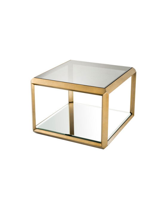 Callum sidobord mässing är en elegant möbel från Eichholtz som kombinerar metall och glas på ett stiligt sätt. Bordets stabila ram med fasade detaljer omger en bordsskiva av tonat glas, vilket ger en modern känsla. Den nedre hyllan i spegelglas tillför både djup och reflektion, vilket gör det till en intressant inredningsdetalj.