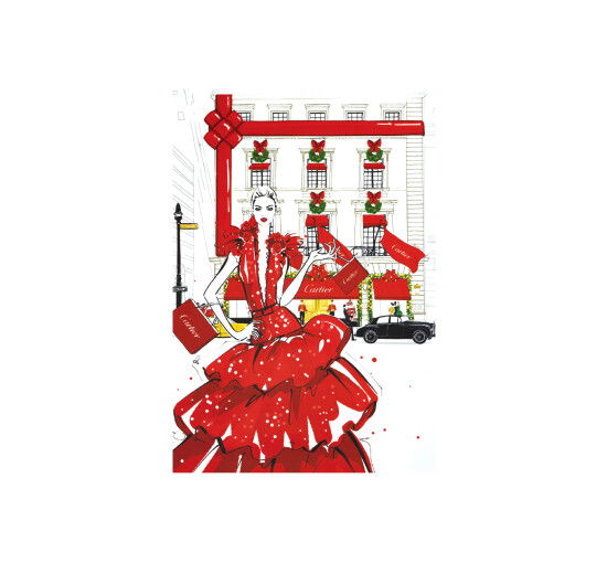 En lyxig och elegant motiv där en fashionabel kvinna klädd i en dramatisk röd klänning står framför en vackert dekorerad butik med klassiska detaljer och en festlig känsla. De röda presentförpackningarna och gröna dekorationerna ger en exklusiv känsla, medan den eleganta svarta bilen och butikens klassiska arkitektur förstärker bilden av sofistikation och glamour. En perfekt hyllning till mode och exklusivitet som passar för att förgylla en stilfull inredning.