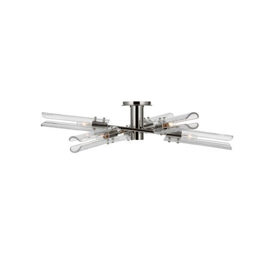 Den eleganta Casoria XL plafond i nickel från Visual Comfort tar inspiration från mitten av 1900-talet och erbjuder en modern touch med skulptural finess. Med sina skarpa vinklar och förlängda glasskärmar ger den ett stilrent och uttrycksfullt utseende som passar perfekt som en fokuspunkt i ditt hem.