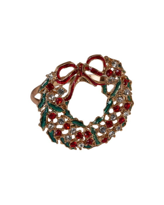Låt julbordet stråla av festlig glans med denna servettring i form av en gnistrande julkrans, dekorerad med röda stenar, gröna detaljer och en elegant rosett. Den skapar en varm och inbjudande känsla som gör dukningen både högtidlig och stämningsfull. Placera den runt servetten för att ge varje kuvert en detalj som lyfter helheten och gör juldukningen extra minnesvärd. Kollektionen är inspirerad av klassisk smyckeskonst och antika samlarobjekt. Varje dekoration är skapad med emaljteknik som framhäver färgernas djup och ger ett strålande ljusspel. Resultatet är små konstverk som förenar traditionellt hantverk med tidlös elegans och förvandlar julens symboler till skimrande smycken för hemmet.
