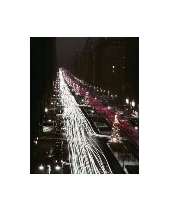 Christmas trees and red and white automobile light trails on Park Avenue, New York, at Christmas time, December 1953. Bring the festive spirit into your home with this stunning artwork by Slim Aarons. Choose from a variety of framing options to suit your style.