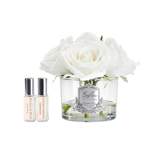 Det eleganta Cinq roses gåvoset innehåller en vacker bukett med högkvalitativa vita rosor av konstmaterial i en ovalformad glasvas. En perfekt kombination av bukett och diffuser, med handgjorda blomblad som har en naturtrogen känsla och doft. Inspirerad av det franska provinsbylivet, med dofter som skapar en romantisk atmosfär. Perfekt som en lyxig present till någon speciell.