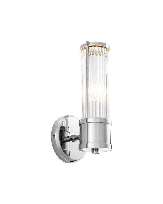 Claridges vägglampa från Eichholtz i nickel finish och klarglas ger en Art déco stil som smälter väl in i din hall eller sovrum. Med sina mått på A. 12, B. 13, C. 29,5 cm skapar lampan en härlig atmosfär. Lampan är avsedd för fast installation och måste kopplas direkt till en elsladd som dras från väggen. Med kabeln på lampan placerad bakom väggplattan kommer den inte vara synlig efter att lampan fästs på väggen.