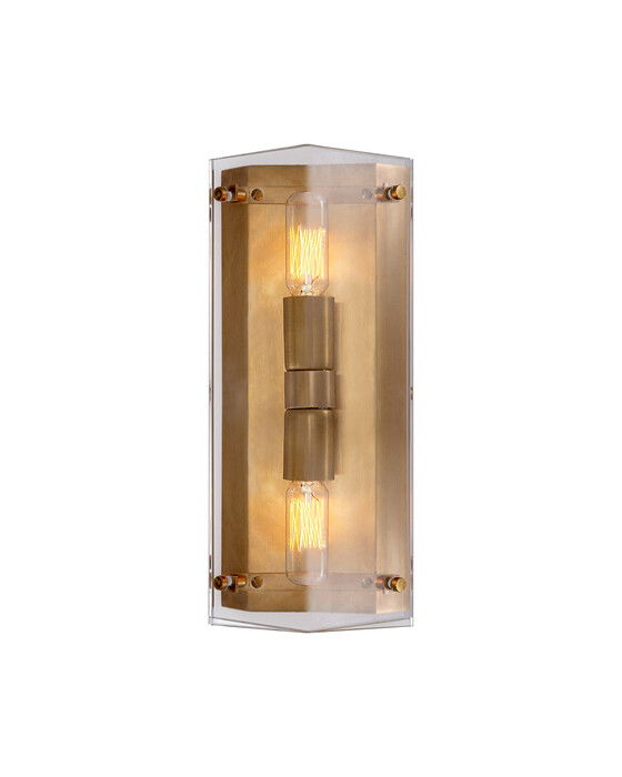 Den unika Clayton från AERIN använder en förlängd, industriell design för att framhäva inre komponenter istället för att dölja dem. Metallstrukturen och Edison-glödlamporna är antingen helt eller delvis synliga, beroende på om armaturen har kristall- eller alabasterskärmar. Alabasterskärmar ger ett mjukare ljus som är perfekt för sovrum, medan klara skärmar ger ett starkare ljus, idealiskt för badrum.