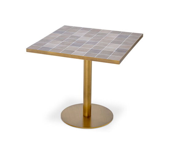 Upptäck en värld av tidlös elegans med matbordet Colton, med en antik mässingsfinish och en sofistikerad keramisk infattning i beige. Denna exklusiva möbel har en fyrkantig bordsskiva som smälter samman hållbarhet med förfinad design.