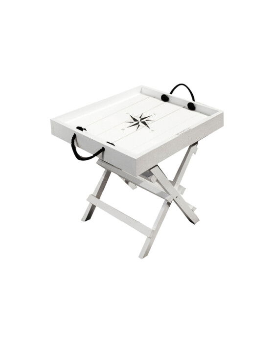 Compass brickbordet är en handgjord möbel tillverkad av svensk furu och belagd med vit organisk färg. Den klassiska designen med raka linjer ger ditt hem en modern kustkänsla. Det charmiga sidobordet har en avtagbar panelad bricka med en handmålad blå kompassros i mitten och dekorativa rephandtag i blått.