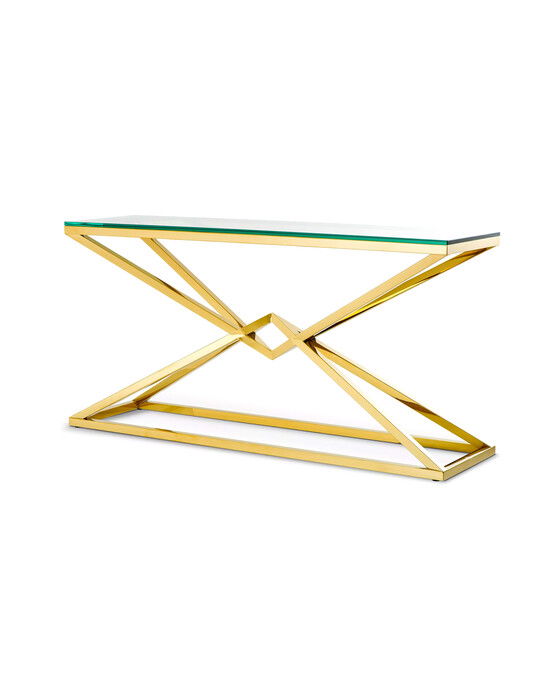 Upptäck mångsidigheten hos soffbordet Connor. Med sin glänsande pyramidbas ger det här designbordet glans och prakt åt din heminredning. Den iögonfallande geometriska basen är gjord av rostfritt stål i en guld finish och en klar bordsskiva i glas. Denna outlet-vara finns i begränsad kvantitet.