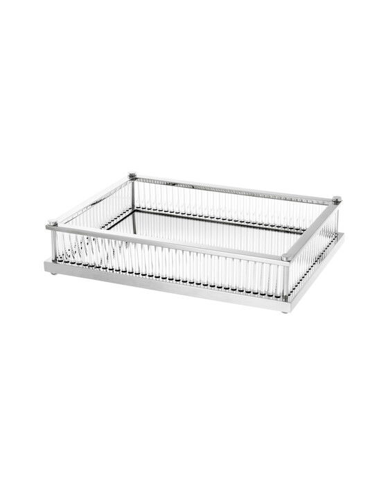 Denna bricka förenar modern design med tidlös finess. Den blanka silverfärgade ramen tillsammans med de klara glasdetaljerna skapar en känsla av raffinerad lyx. Spegelbottnen fångar upp och reflekterar ljus på ett sätt som förhöjer allt du placerar på den, oavsett om det är kristallglas, doftljus eller dekorativa föremål.