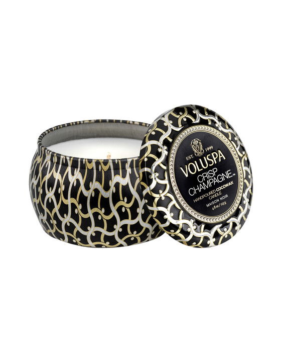 Voluspa Crisp Champagne är ett lyxigt doftljus från serien Maison Noir gjord av krämig kokosvax, som gör att ljuset utsöndrar en mycket kraftfull och generös doft. Dessutom gör kokosvaxet att ljuset brinner med en klar låga och ger doftljuset en lång brinntid. Crisp Champagne ger en doft av sprudlande champagne med inslag av vanilj och ekfat. Spännande och gott. Ljuset ligger i en vacker plåtburk med dekorativt mönster i mörka färger. Doftljuset är försett med en veke och brinner i 25 timmar. Sprid en trivsam och elegant doft i ditt hem med detta lyxiga ljus. När det är slut kan du återanvända den vackra plåtburken till exempelvis förvaring av smycken. Vikt: 113 gram.