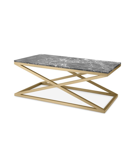 Criss Cross är ett trendigt soffbord med en x-ram i rostfritt stål med en borstad mässingfinish och en skiva i grå marmor. Det stilrena och eleganta bordet är en snygg inredningsdetalj i vardagsrummet som lockar till sig uppmärksamhet.