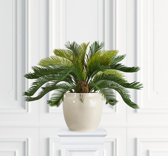 Den gröna Cycas krukväxten är en imponerande växt med stora vackra palmblad som gör den till en vacker prydnad i en kruka vid entrén, på balkongen eller inomhus. Med en höjd på 70 cm och en diameter på 21 cm vid överkanten och 14 cm vid underkanten, håller sig denna växt alltid lika fin år efter år.